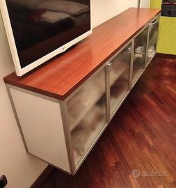 vendo madia con ante alluminio satinato e vetro acidato. La cassa -a modulo unico- è in bilaminato bianco con profili alluminio satinato con in appoggio un top bilaminato ciliegio. Le dimensioni totali sono 35x180xh53. Date le dimensioni l'arredo non è spedibile. Sto liberando spazio, invito ad osservare altri miei annunci.
