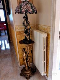 Lampada in vetro cattedrale con statua in resina colore bronzo, raffigurante uomo e donna con Albero.