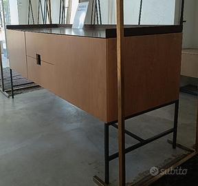 Arredamento per negozio di abbigliamento comprensivo di banco cassa, banco espositivo con cassettoni contenitori, parete attrezzata per esposizione, cinque stendini espositivi, due pedane vetrina, tendaggi e accessori per camerini prova.