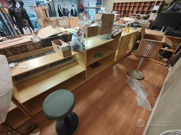 - N.1 banco vendita composto da 5 pezzi di 120 cm cad. e diagonale, colore beige chiaro - N.1 Monitor 27 pollici - N.8 espositori abbigliamento porta grucce, - N.3 manichini tipo “adulto” - N.6 manichini tipo “bambino” - N.11 tavoli in legno, colore bianco - N. 10 scaffali libreria in legno marrone IN VENDITA ALL'ASTA IL 30/4/2026. PER INFORMAZIONI CONTATTARE MERCURY AUCTIONS