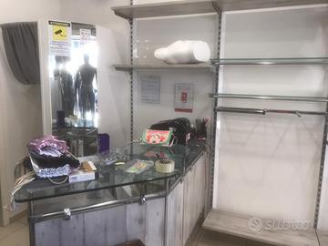 Arredo negozio, perfetto stato Pareti attrezzate con relative mensole in vetro ed effetto legno Carrellini espositivi (2) Manichini vari