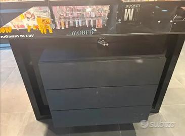 • Mobili Espositori: Varie unità con ripiani inclinati per esposizione prodotti (make-up/cosmetici), completi di cassettiere alla base per lo stoccaggio della merce.