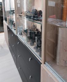 2 moduli vetrina 95x240x40 chiusi da vetri scorrevoli e illuminazione interna laterale a led con ante nella parte inferiore. 2 moduli vetrina 95x240x40 chiusi da vetri scorrevoli e illuminazione interna laterale a led con cassettiera nella parte inferiore. 2 moduli vetrina 110x240x40 chiusi da vetri scorrevoli e illuminazione interna laterale a led.