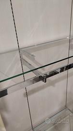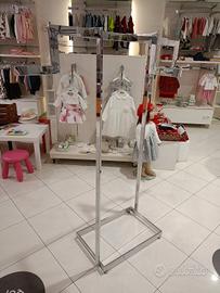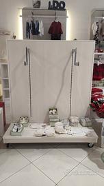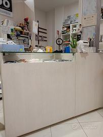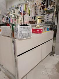 vendo arredo per negozio, composto da 8 pannelli in legno con rifinitura in rovere, e appenderie, banco cassa, banco da lavoro con cassettiera, gondola e appenderie. Vendibile completo o singolarmente.