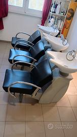 vendo arredamento parrucchiere comprensivo di tre lavatesta ,isola tecnica con 4 posti tecnici con sedute in plexiglass più 4 posti stilistici con specchi a parete e sedute in pelle con pistone +2 mobiletti di servizio elettrificati , una cassa , e una panca attesa.
