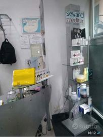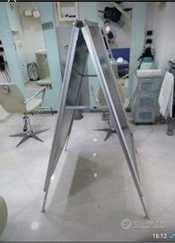 2 sedie per Parrucchiere struttura in acciaio è PELLE di colore Champagne con pompa idraulica, una sedia con poggia testa e pedana poggiapiedi lunga incorporato, l'altra sedia senza poggiatesta ma con poggiapiedi mobile da terra in acciaio satinato, Alzata cuscino in PELLE per bambino misura 40cm, sempre in tema di colore Champagne...tutto dell'azienda (Gamma linea MG BROSS) una mensola a muro porta asciugamano linea (GAMMA) con Desain ondulato di colore arancio, un espositore da terra per prodotti con 4 mensole in vetro dell'azienda (ELEN SEWARD) 6 mensole a cubo di Ikea in legno di colore crema per esposizione prodotti da installare a muro, Banner Pubblicitario per Esterno modello cavalletto con 4cornici a scatto tutto in alluminio satinato misura altezza 1 metro da terra, larghezza 80cm