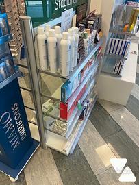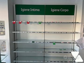 Arredo per farmacia “come nuovo” in laminato bianco e cristalli trasparenti, struttura metallica completa di accessori porta blister. Composta da: