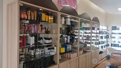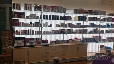 Arredamento completo per attivitá commerciale al dettaglio. Cassettiere in legno e ripiani in vetro, retroilluminazione led.