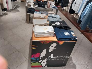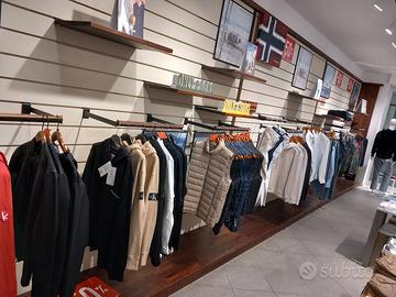 vendo arredo completo negozio di abbigliamento, bancone per la cassa originale Napapiri, tavoli in legno e acciaio, pareti completi di ganci e mensole sia in legno che vetro.