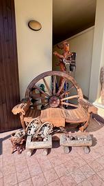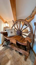 Splendida panca artigianale realizzata trasformando un’autentica ruota di carro in legno, perfetta per aggiungere un tocco di charme rustico ai tuoi spazi.