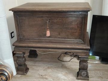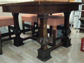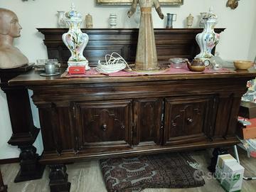 Vendo arredo completo per sala del primo '900 in stile medievale composto da tavolo allungabile, 6 sedie, credenza, credenza autentica del 1500 con vetrinetta, bauletto autentico del 1600 e colonna.