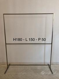 Stand in acciaio spazzolato di due misure 10 pezzi alti e 5 bassi (vedi foto) quelli piu bassi hanno le rotelle, vendo 30,00 euro l’uno. La versione più alta 6 pezzi hanno una sbarra smontabile, posizionatile su 3 livelli differenti. Ritiro a carico del acquirente.
