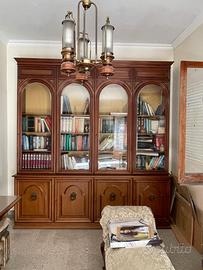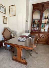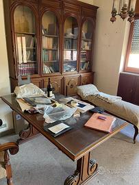 Vendesi arredi storici provenienti da prestigioso studio medico. Mobili di alta ebanisteria in legno massiccio, perfetti per professionisti che desiderano uno studio di rappresentanza o per amatori del genere. Pezzi: Libreria Monumentale (4 ante): Elegante doppio corpo con vetrate superiori ad arco e fregi inferiori. Scrivania Direzionale da Studio: Piano imponente con vetro protettivo, basi a lira lavorate. Lettino Medico da Visita (Dormeuse): Struttura in legno con gambe mosse e imbottitura damascata, pezzo raro. Lampadario Vintage: Tre luci in ottone, legno e vetri satinati coordinati. RITIRO Zona Napoli Lo smontaggio e il trasporto sono a totale carico e cura dell'acquirente. Il prezzo lo fate voi, pertanto si valutano proposte d'acquisto. Per ogni informazione o per concordare una visione del mobilio, non esitate a contattarmi.