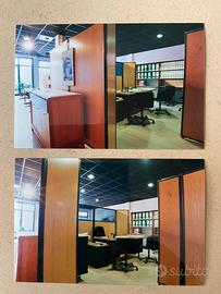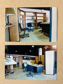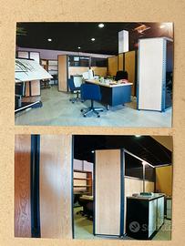 Mobili per ufficio, rappresentanti da pannelli adatti all’open space. Essi sono modulari e orientabili a piacimento (vedere allestimento nelle foto e nell’immagine del depliant), la maggior parte nobilitati in frassino, alcuni con policarbonato fumé, attrezzabili con mensole e accessori a cremagliera di cui la maggior parte dei pannelli sono dotati, fornisco anche 7 coppie di mensole con aggancio alle cremagliere oltre a 7 ripiani in legno listellare, nobilitato in frassino.