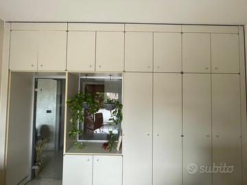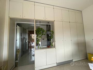 Vendo parete divisoria attrezzata di alta qualità, ideale per ambienti ufficio o studi professionali. La struttura è realizzata in pannelli modulari con finitura color avorio, dal design lineare e pulito, perfetta per ambienti moderni e ordinati.