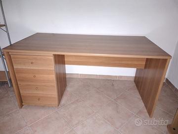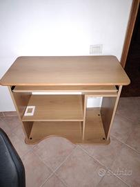 poltrona in pelle nera con ruote, scrivania con cassettiera e mobile porta pc, tutto in legno.