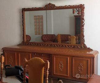 Lotto di arredi composto da: soggiorno in stile spagnolo con sei sedie, un grande tavolo da otto posti, un mobile libreria, un mobile con specchiera, un divano in pelle a tre posti in inglese ‘800 più due poltrone analoghe, un lampadario in legno e metallo ottonato in stile inglese ‘800, un tavolino da salotto in legno massello, un capiente appendi abiti in legno massello in stile classico ‘800.