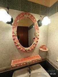 Specchio ovale di colore rosa in ceramica, con mensola porta spazzola e porta spazzolini. x chi è interessato munito di lavello con rubinetteria. applique in ferro battuto colore verde con porta lampada. (a parte €.45).