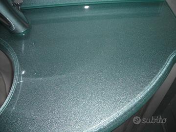 Svendita arredobagno nuovo da esposizione da cm 120, profondità cm 50, laccato Bianco Lino lucido, composto da base porta lavabo, n. 2 basi laterali a smusso, specchio sospeso con 2 faretti alogeni con interruttore e presa laterale, top in cristallo Verde argentato metallizzato spess. 2 cm, lavabo Ovale sottopiano e zoccolo smontabile.