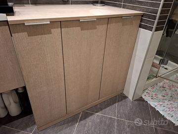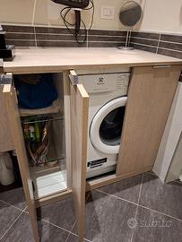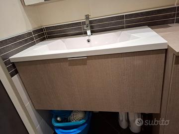 In ottime condizioni, specchiera contenitore divisa in tre settori e con luce superiormente P. 19,5-L. 120-H 79 CM; cassettone sotto lavello e lavello con rubinetteria P 50.5- L. 96- H 48; mobile coprilavatrice con annesso mobiletto a