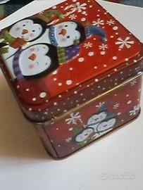 Alcune scatole VINTAGE/Modernariato, contenitori in latta pubblicitari di prodotti : a) Scatola in ALLUMINIO "Cialde di Montecatini" (forse anni '30) diametro 18 - 17 altezza 7 scritte in rilievo caratteri "Art Nouveau". Con diverse ammaccature, ma sistemabili. Versione rinforzata, e più curata, con nervature concentriche. b) Scatola metallica del gioco "Kaleidos" coperchio incernierato. Versione originale Francia. cm. 27x22x7 Condizioni ottime, senza bolli. c) Secchiello dolci "Chupa Chups" in latta (consistente) 17 cm. Ø alla base e 18,5 alla bocca. Altezza 20 Ottime condizioni interne ed esterne. d) Scatola metallica caramelle "CAFFAREL" "cilindrica" a sezione ovale, altezza 29 cm x larghezza 14 Scritta "Caffarel" in rilievo. Condizioni buone, con qualche segno leggero. e) Scatoletta metallica AUGURI. Temperino doppio per matite 2 misure. Vintage norvegese con scritta " Best Wishes You ! " cm. 6,7 x 4,7 x 4,7 f) Scatoletta metallica natalizia, rossa decorata con tre pinguini, decorazioni che diventano in rilevo sul coperchio. quasi cubica: cm. 7,5 x 7,5 x 6,5 (altezza) NUOVA Vendo eur: a) 40 ; b) 18 ; c) 16 ; d) 30 ; e) 6 ; f) 6 importi trattabili e possibili abbinamenti e sconti con acquisti multipli e/o anche su altri miei annunci, per esempio: SCONTO "3 x 2" su diversi articoli. Visione e consegna gratuita in Torino.