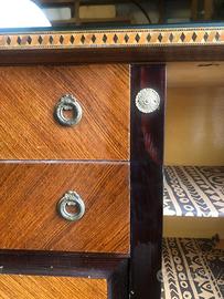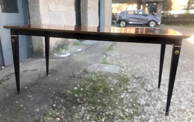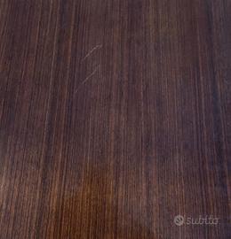 Sala da pranzo vintage anni '50- '60, composta da credenza con 2 sportelli con mensole interne e 2 cassetti centrali, lungh. cm. 187, largh. cm. 47, h. cm. 94, presenta due graffi ed una zampa rotta (vedi foto) + tavolo lungo cm. 175, largo cm. 81, h. cm. 78, le gambe sono a sezione quadrata che vanno a restringersi in fondo; tutti in legno di due colori (marrone e nero) e legno naturale dove le venature diventano un elemento decorativo e distintivo, elegante design, i dettagli in metallo anticato, di maniglie e borchie, arricchiscono l'estetica vintage di questi mobili, la credenza poggia su gambe triangolari che terminano con sabot in metallo, necessita di riparazione, il piano superiore in vetro e il delicato intarzio offrono una superficie elegante, se la vendita verrà a breve verranno regalate anche 6 sedie nello stesso stile, usato ma in buono stato, solo ritiro in zona Marsciano di Perugia, contattare telefonicamente Claudia al 333/2297506