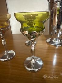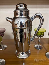 Un set da cocktail vintage in acciaio inox e vetro multicolore in stile Mid-Century Modern, in perfette condizioni. Questo elegante set include uno shaker, e sei calici in colori intensi e vivaci: due ambra, due verdi e due ametista. Perfettamente bilanciato tra forma e funzionalità, questo set è un complemento ideale per qualsiasi spazio di intrattenimento o per una vetrina da collezione.