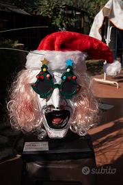 Riproduzione della testa di Art il Clown del film terrifier 3 stile Christmas. La struttura di base è di legno dove un palo scavato in ferro è stato bullonato e successivamente fissata la testa.