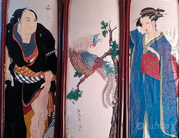 Uno stupendo paravento dipinto a mano su seta, con personaggi della tradizione giapponese. Si tratta di 3 pannelli a cuspide da paravento, racchiusi nella struttura originale in legno di bambù dipinta di rosso bolo (misura 180 cm x 46 cm). Il paravento, da appendere al muro, è Art Decò francese, realizzato artigianalmente, dipinto a mano su taffetà di seta bianco-avorio. Gli elementi sono perfettamente conservati, senza difetti salvo qualche piccolo segno del tempo come piccoli graffi nel colore sulla struttura di bambù. La conservazione degli oggetti è come da foto, con segni del tempo e segni di usura. E' richiesto il ritiro. Grazie