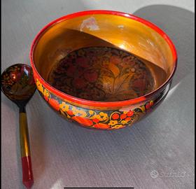 Ciotola in legno Russa in buone condizioni, segni di usura all’interno. Cucchiaio in ottime condizioni