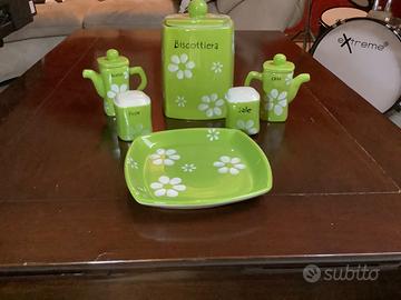 Prezioso set in ceramica per la cucina comprendente saliera ,pepe,olio,aceto,biscottiera e vassoio