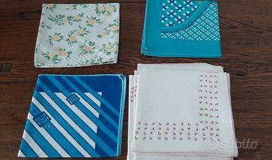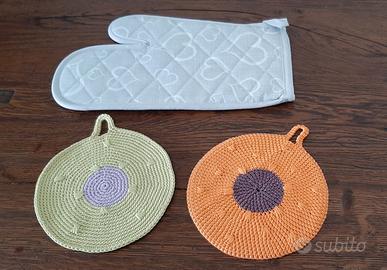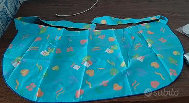 Set di grembiuli in cotone per la cucina, con fantasie colorate. - Grembiule azzurro nuovo a vita marca Bassetti - Due grembiuli nuovi con pettorina - 1 guanto per forno nuovo - 2 presine rotonde nuove - 10 tovaglioli misti Prezzo totale
