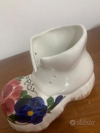 Da ARTIGIANATO FRIULANO, BROCCA in CERAMICA raffigurante uno SCARPONE, dipinto a MANO con motivi FLOREALI e con la scritta FRIUL. Usato solo come ARREDO. Dimensioni h 12 cm, largo 10 cm lunghezza 20 cm.