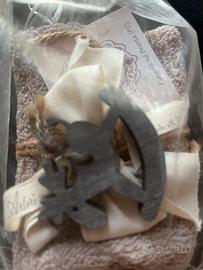 Asciugamano da ospite con renna profumata per ambienti o biancheria in confenzione originale, mai aperta ed ancora con cartoncino dell’artigiana che ha preparato la confezione.
