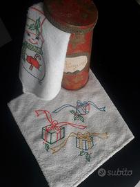 Confezione regalo natalizia, composta da un barattolo di latta, alto cm 25, foderato esternamente e decorato a mano con la scritta" Auguri "dipinta in rilievo su tela Aida. Contenente due asciugamani di spugna di cotone bianca, di CM 37 x 60 dipinti a mano con soggetti natalizi e colori indelebili. Nuovi ,adatti per un regalo natalizio. Spedizione gestita dal venditore.