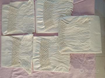Vendo 5 bellissimi asciugamani in fiandra. Non sono mai stati utilizzati. Qualche asciugamano presenta qualche segno del tempo (come da foto) ma nulla che non si possa eliminare con un buon lavaggio.