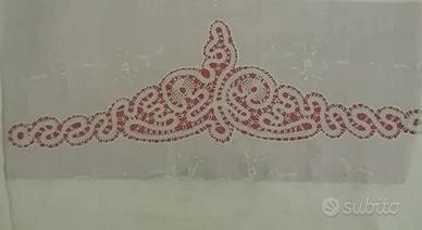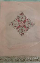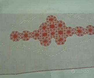 Asciugamani in puro lino ricamati a mano con frangia, applicazioni a chiacchierino/uncinetto/tombolo di varie misure. Prezzi da 30€ a 60€.