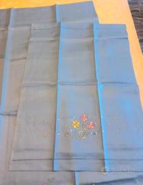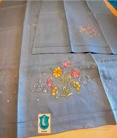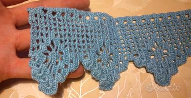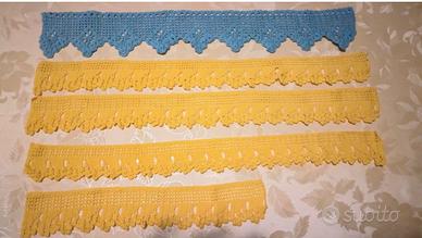 Set 2 asciugamani puro lino 100 %, colore celeste con motivo floreale. Rifinitura orlo a giorno. Dimensioni asciugamano viso: 100 cm × 64 cm. Dimensioni asciugamano ospite: 61 cm × 44 cm. Completamente nuovi, mai usati. Confezione in plastica originale. Possibilità di applicare i pizzi ai bordi degli asciugamani. Set 11 bordure all'uncinetto fatte a mano fiori, piccoli archetti, ideali per rifinire tende, asciugamani o qualsiasi altro tessuto. Dimensioni: 1 bordura ( fiori azzurri) 47 cm × 7 cm 1 bordura ( archetti gialli) 48 cm × 5 cm 1 bordura ( archetti gialli) 48 cm × 5 cm 1 bordura ( archetti gialli) 49 cm × 5,5 cm 1 bordura ( archetti gialli) 31 cm × 5,5 cm 1 bordura ( archetti bianchi) 54 cm × 6,5 cm 1 bordura ( archetti bianchi) 54 cm × 4 cm 1 bordura ( archetti bianchi) 61 cm × 4 cm 1 bordura ( archetti bianchi) 38 cm × 5 cm 1 bordura ( archetti bianchi) 38 cm × 4 cm 1 bordura ( archetti traforato) 69 cm × 4 cm Set 2 bordure all'uncinetto fatte a mano quadrifoglio e motivo floreale. Dimensioni: 1 bordura (quadrifoglio) 150 cm × 6 cm 1 bordura ( 4 fiori bianco) 38 cm × 7 cm. Set 3 bordure all'uncinetto fatte a mano farfalle e canestrini. Dimensioni: 1 bordura ( 4 farfalle) 45 cm × 7 cm 1 bordura (5 canestri colore bianco) 38 cm × 10 cm 1 bordura (5 canestri colore arancione) 38 cm × 9 cm. Set 5 bordure all'uncinetto fatte a mano disegno cagnolini e rombi. Dimensioni: 2 bordure (5 cagnolini) 42 cm × 9 cm 2 bordure (9 rombi) 54 cm × 7 cm 1 bordura (9 rombi) 51 cm × 6 cm Tutte le bordure sono nuove, lavate, non presentano macchie o ingiallimenti.