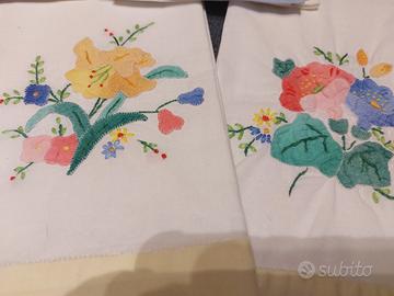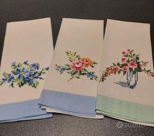 9 asciugamani di fine cotone piccoli misure cm. 34×55 numero 6 sono con applicazioni floreali e 3 sempre floreali ma a punto croce, tutti rigorosamente cuciti a mano. Si vendono anche singolarmente a € 3,00 cadauno, se acquistati in toto regalo 2 porta tovaglioli della stessa serie. Sono stati lavati perché erano in un cassetto da tempo