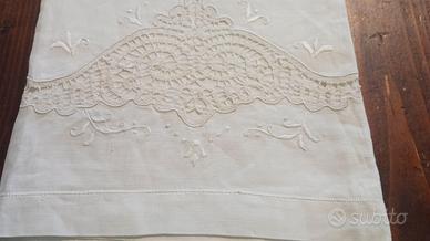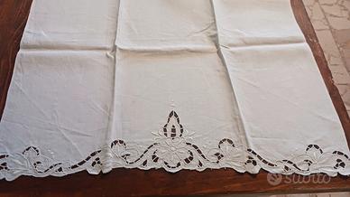 tre antichi asciugamani in puro lino bianchi mai usati con bellissimi ricami Cantù ed a intaglio. più deliziosi ricami in perfetto stato ,possibile fare anche tende per finestra misure altezza 125 cm larghezza 65 cm