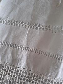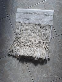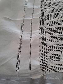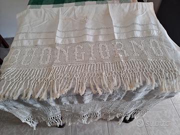 Era dei nonni. Dovrebbe essere in puro cotone oppure canapa. Scritta BUONGIORNO su entrambi i lati fatta all'uncinetto. Iniziali su di un lato. Segni del tempo visibili che ne certificano l'autenticità!! Lasciato al sole qualche giorno ma appositamente non lavato. Un cimelio di famiglia.