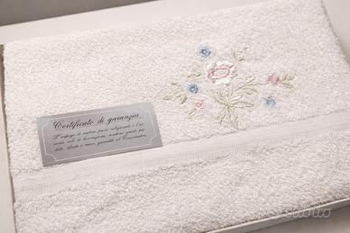 Asciugamano da bagno Linea Valentino in 100% puro cotone, colore panna/avorio, con delicato ricamo floreale nei toni rosa, azzurro e verde. Articolo nuovo, mai usato, ancora nella confezione originale con certificato di garanzia. Spugna morbida e corposa, piacevole al tatto e di ottima presenza, ideale sia per uso personale sia come idea regalo. La confezione presenta solo lievi segni esterni dovuti alla conservazione, visibili in foto.