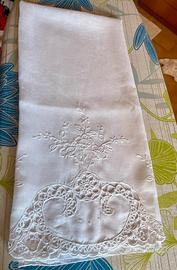 Asciugamano in cotone bianco con preziosi ricami di nonna . Bello da esporre in bagno o carino anche come tendina finestra. Come nuovo.