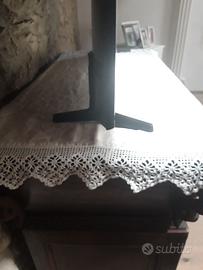 In tessuto naturale di cotone e canapa con pizzo eseguito a mano in filo di cotone.