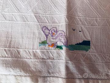 Quattro asciugamani, due da viso e due da ospite, bianchi danascati ricamati a punto croce a mano con filo DMC. Tessuto lino e cotonr, lavati ma mai usati.