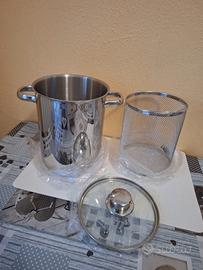 Aspargera in acciaio con manici, cestello e coperchio, ideale per la cottura verticale degli asparagi, preservandone il gusto e i valori nutrizionali. È dotata di un apposito cestello in acciaio leggerissimo, che vi permetterà di scolare gli asparagi una volta cotti con il massimo della semplicità, e di un coperchio in vetro, che vi permetterà di tenerne sotto controllo la cottura. I manici permettono una presa sicura in ogni circostanza di utilizzo. L'aspargera è adatta al piano a induzione.