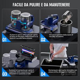 Aspirapolvere per Materassi Battimaterasso Antiacaro con Luce UV-C a 253,7 nm 16Kpa Aspirazione Filtro HEPA Riscaldamento Ultrasuoni Funzione Rotazione della Spazzola a 30000 giri/min 500W Filo Blu =========== =================== MarchioJPHYLL Caratteristica specialeLeggero, Luce UV a 253.7nm e funzione di riscaldamento, Ultrasonico, Filtro HEPA Tipo di filtroFiltro HEPA Componenti inclusi1*Aspirapolvere da letto, 1*Filtro di ricambio, 1*Mini spazzola per la polvere, 1*Manuale d'uso È cordless?No Superfici consigliate Materassi, trapunte, divani, cuscini, tappeto, tappezzeriaMaterassi, trapunte, divani, cuscini, tappeto, tappezzeria Mostra altro Sorgente di alimentazione Con cavo elettrico Tensione 230 Volt (CA) Peso articolo 3,8 Libbre Informazioni su questo articolo PRESTAZIONI DI PULIZIA POTENZIATE: Il motore da 500 watt del nostro aspirapolvere per acari dei materassi offre un'impressionante potenza di aspirazione di 16KPa per una pulizia profonda che non lascia residui; Rimuove efficacemente tutti gli acari dalla superficie del materasso fino in profondità; L'ampia apertura di aspirazione facilita il trattamento di letti queen-size e lunghi divani in pochi minuti, risparmiando tempo ed energia TECNOLOGIA QUINTUPLA: Il nostro versatile aspirapolvere UV per letto utilizza diverse tecnologie, tra cui la luce UV-C a 253,7 nm, la tecnologia ad ultrasuoni, il riscaldamento motorizzato a 60°C, il rotolamento della spazzola a 30000 giri/min e una potenza di aspirazione di 16 kpa; Rimuove il 99,9% degli acari e dei batteri nascosti nei materassi, mantenendoli asciutti e garantendo una vita domestica più salutare FILTRAZIONE HEPA: Questo aspirapolvere per materassi è dotato di un filtro HEPA che cattura efficacemente particelle fino a 0,3 micron, con un'efficienza di filtrazione del 99,97%; Ciò impedisce i blocchi e aiuta a mantenere le prestazioni ottimali; L'aspirapolvere include anche due coppe snap-on, ognuna rimovibile e lavabile per una manutenzione senza