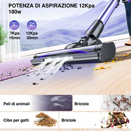 Potente aspirazione fino a 12Kpa: il motore brushless da 180W cattura facilmente polvere, peli di animali, briciole e detriti su qualsiasi superficie.