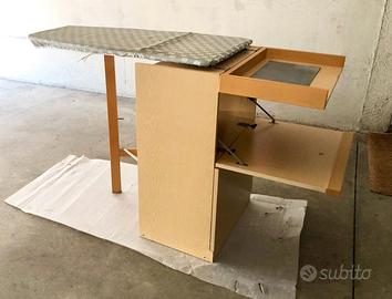 Asse da stiro LoStiro di Foppapedretti. Mobile di legno chiaro, cm 55x38x90 chiuso / lunghezza tutto aperto cm 140 / altezza piano stiro cm 86 / misure asse da stiro cm 100x50. Compasso di apertura asse e tenuta cerniere ripiani ottimi. Asse imbottito, con sopra coperta originale grigia chiara stampata con marchio e sfiatatoi. 4 rotelle di gomma alla base. Peso circa kg 20+