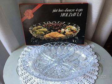 Antipastiera con 4 scomparti, in vetro pressato, marchio “ Les Verreries du Gier”, anni ‘70, nuova e ancora dentro la confezione originale.